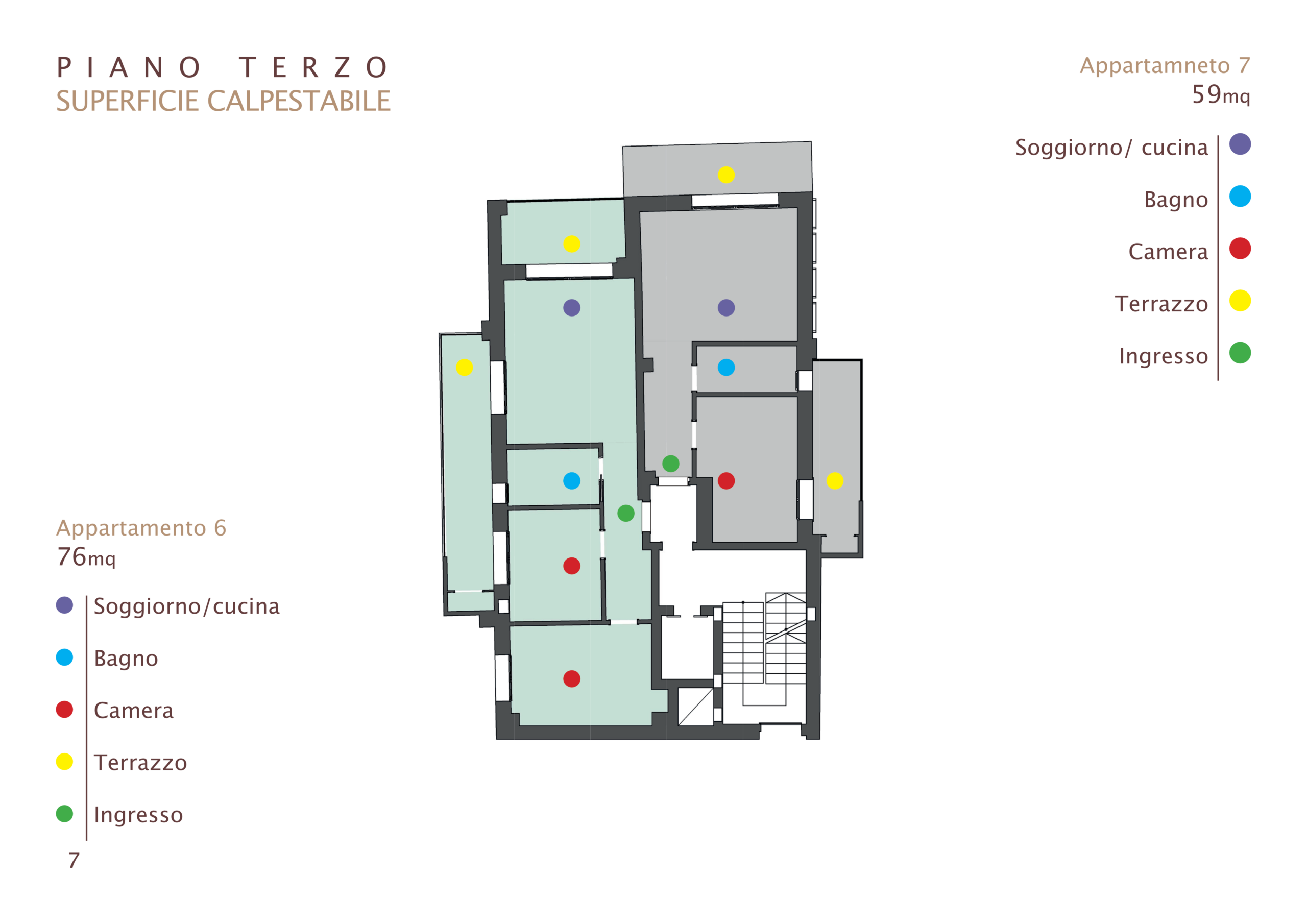 I pavimenti degli appartamenti posti al 1° e 2° piano sono in gres porcellanato, mentre gli appartamenti posti al 3° e 4° piano hanno doghe in vero legno di rovere, battiscopa bianco.
